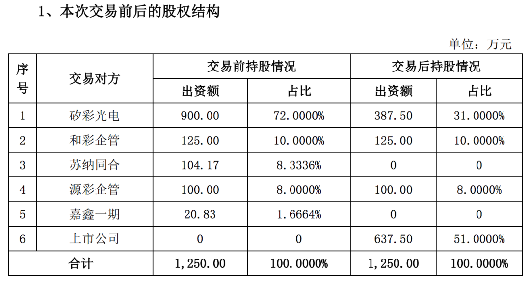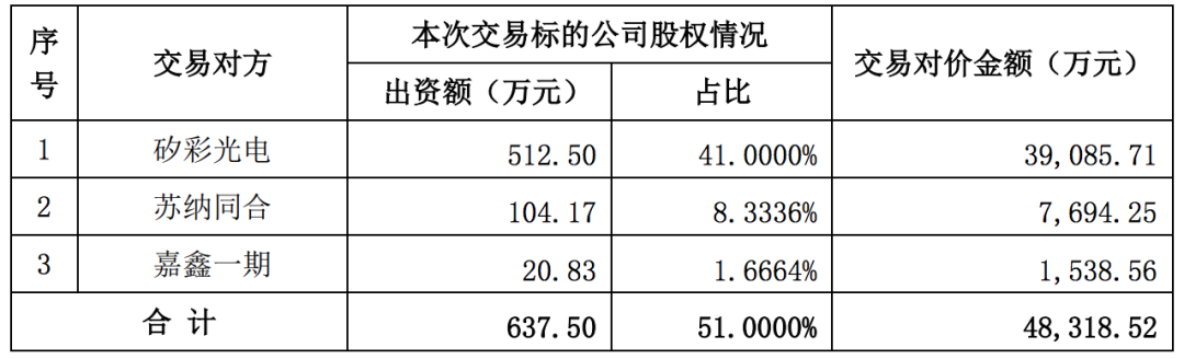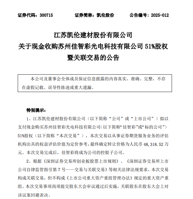 ![]() 4月2日晚间,江苏凯伦建材股份有限公司(以下简称“凯伦股份”)发布重大资产交易公告,宣布拟以支付现金方式收购苏州佳智彩光电科技有限公司(以下简称“佳智彩”)51%股权,交易价格达48,318.52万元,此交易构成关联交易。 ![]() ![]() 根据协议,凯伦控股、钱林弟、绿融投资拟通过协议转让方式向矽彩光电、陈显锋合计转让持有的公司股份53,634,200股,占公司总股本(剔除公司回购专用账户中的股份数量7,785,360股后的股本370,270,070股)的14.4852%。其中,矽彩光电受让34,134,200股,占公司总股本的9.2187%,陈显锋先生受让19,500,000股,占公司总股本的5.2664%。 ![]() 该《股份转让协议》自各方签订之日起成立,自凯伦股份与相关交易对方就收购佳智彩51%股权签署的正式《股权收购协议》生效之日起生效,且效力与《股权收购协议》保持一致。本次交易完成后,矽彩光电持有上市公司9.2187%的股份,陈显锋持有上市公司5.2664%的股份。 苏州矽彩光电科技有限公司 ![]() ![]() 苏州工业园区苏纳同合纳米技术应用产业基金合伙企业(有限合伙) ![]() ![]() 南通嘉鑫一期股权投资基金合伙企业(有限合伙) ![]() ![]() 佳智彩主要财务数据 2023年、2024年度财务数据已经天健会计师事务所(特殊普通合伙) (具有证券、期货从业资格)审计,并出具标准无保留意见的天健审[2025]1072 号《审计报告》,主要财务数据如下 ![]() ![]() 苏州佳智彩光电科技有限公司成立于2017年11月,是一家专业从事显示面板、新能源及半导体行业光、机、电测试及生产解决系统、工艺设备和软硬件研发、集成生产、销售与服务的“一站式“提供商,核心团队由海归博士、行业专家以及高级管理人才、营销精英组建,致力于实现“用佳智彩显示世界”。 公司团队长期专注与深耕“超高分辨光学成像技术”、“智能图像处理技术”、“大数据分析与机器学习技术”、“机器视觉自动化”技术、“精密光学检测与修复”、“芯片功能验证系统”、“FPGA选型”以及“电源管理”等领域技术,不断深耕显示面板检测及修复设备的研发制造,同步已经构建了新能源检测和生产的眼睛和大脑,同时我们也踏上了半导体量检测装备国产化的道路,力争做产业中自主创新的赋能者。公司同步申请和获得授权核心自主知识产权100多项。获得了各项荣誉资质:吴江区科技领军人才;市企业工程技术中心;省民营企业;市重点产业技术创新项目;高新技术企业;吴江区首台(套)装备首批次新材料认定;省工程企业技术中心;省专精特新中小企业;国家级专精特新小巨人企业等称号,还承担了科技部重点研发项目等。 点击图片可联系我们了解报告详情
